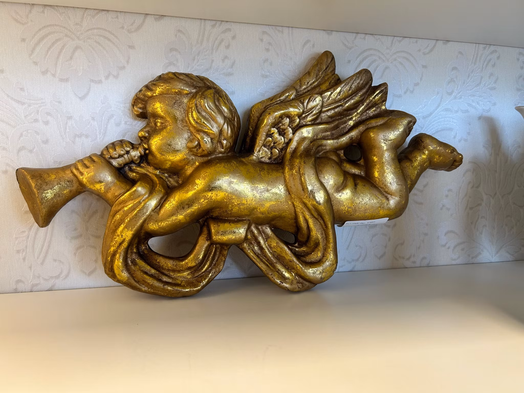 Vacker handmålad ängel med trumpet. Perfekt som väggdekoration, stående på hylla eller valfri plats där den ger charm och hemkänsla.