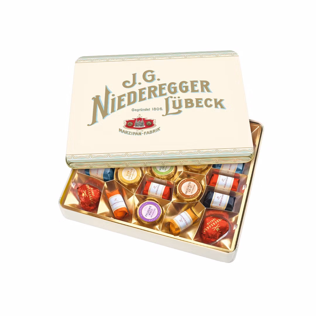 Niedereggers mest populära marsipanvarianter i en elegant nostalgiask av plåt: klassiska marsipanbröd med mörk choklad, marsipanhjärtan, marsipanbröd med smaker av apelsin, ananas och espresso, samt marsipan med likör i smakerna plommon, apelsin och päron.