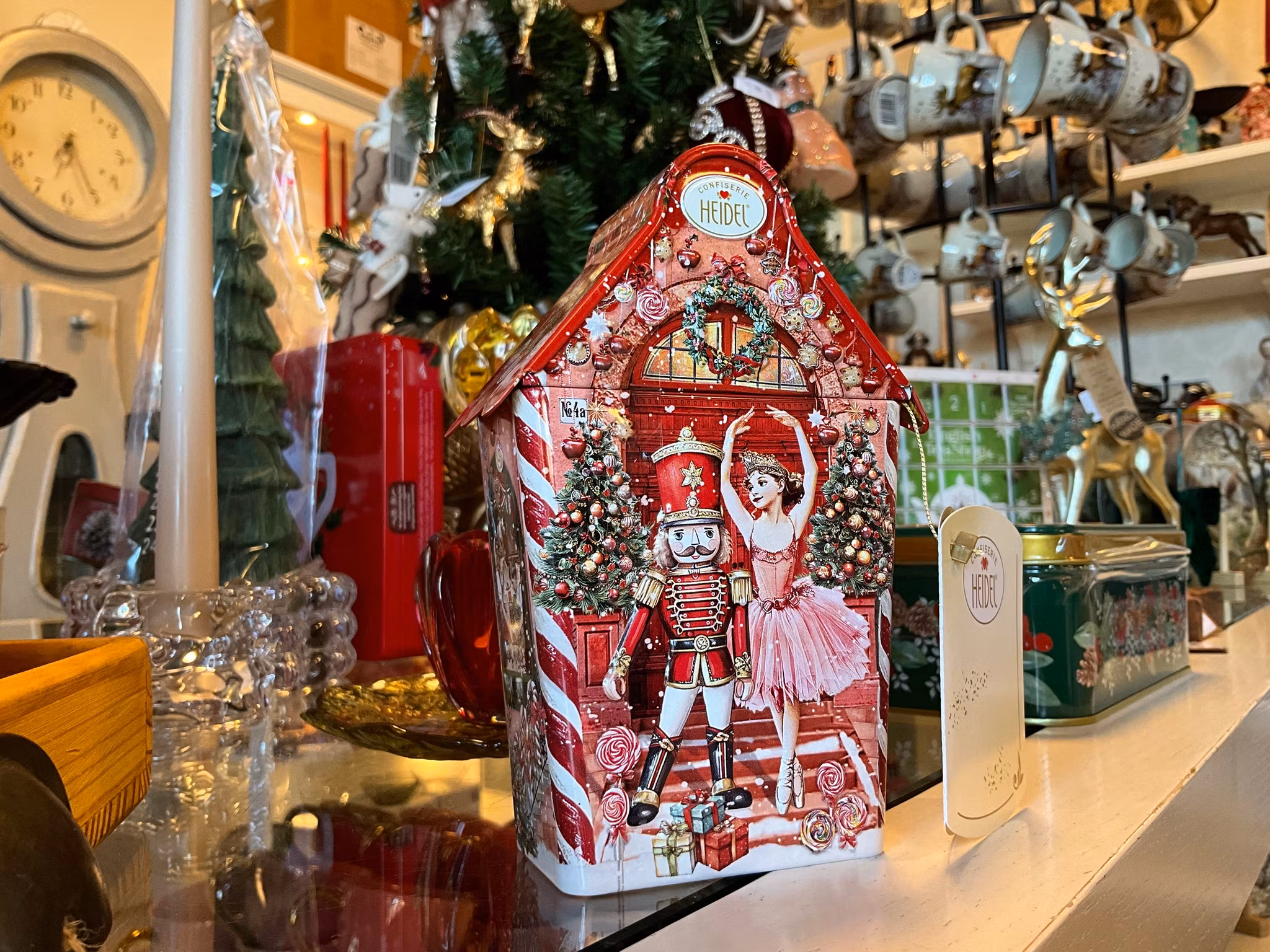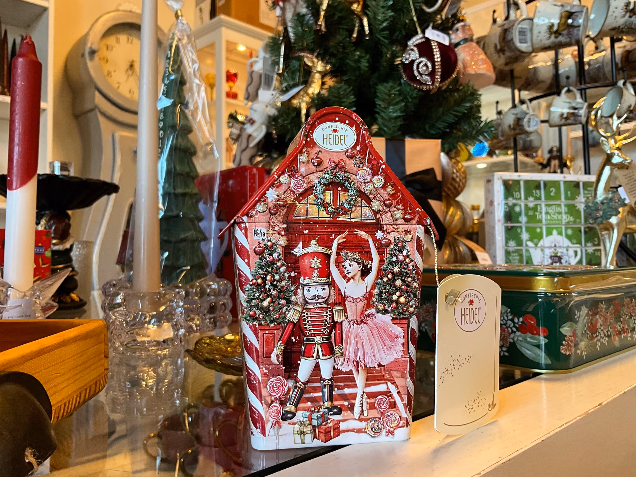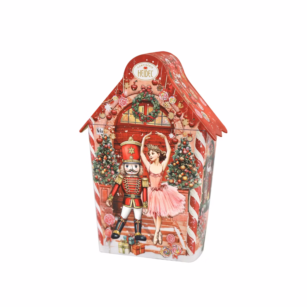 Ett underbart julhus i plåt med motiv från den klassiska sagan om Nötknäpparen – fullt av nostalgisk julstämning! Inuti finns en mix av mjölkchokladkakor och fyllda chokladpraliner med len praliné- och mjölkkrämsfyllning (totalt 74 g).