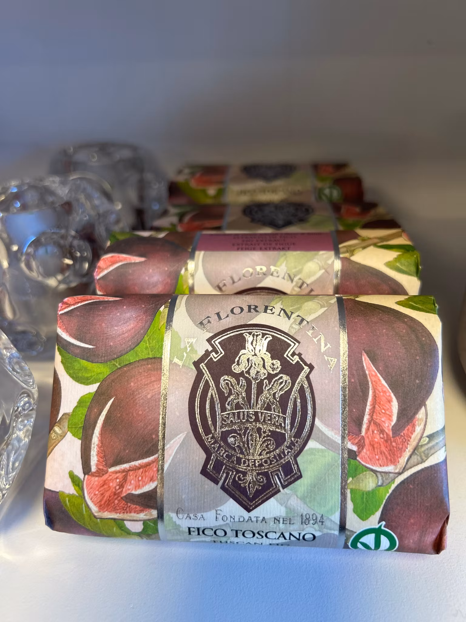 Vacker tvål handgjord i Toscana med en speciell vegetabilisk formel med olivolja och ekologiskt naturligt fikon extrakt, berikad med karitesmör som ger en extra fuktgivande och krämig effekt.