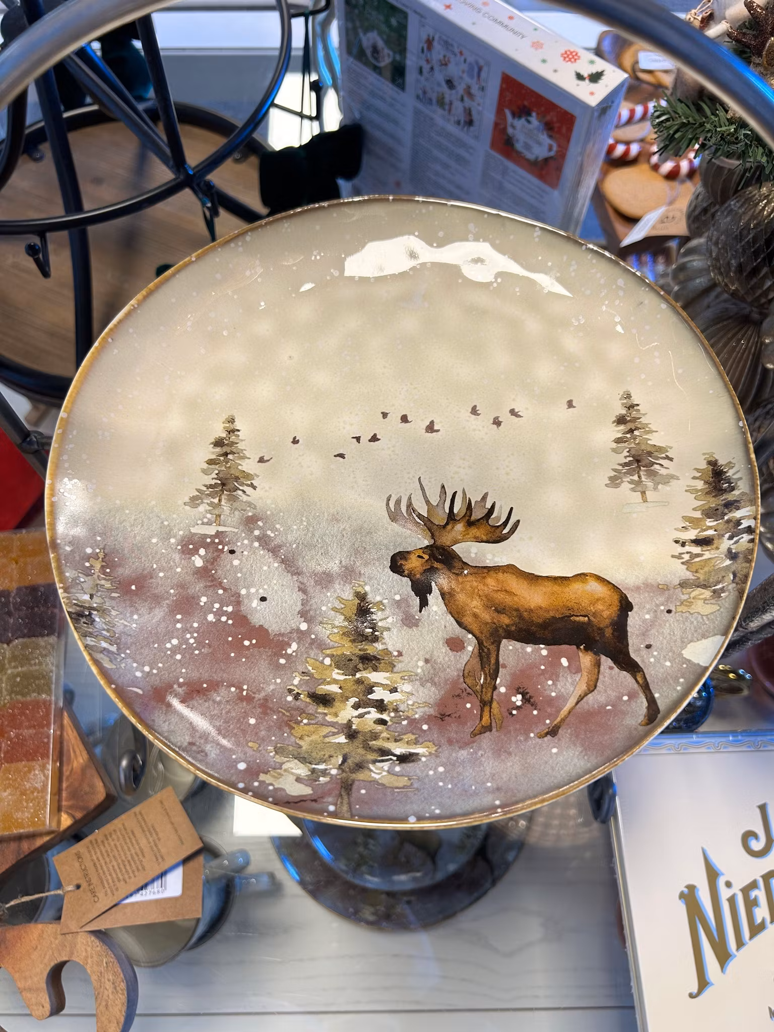 Miljögården erbjuder skandinaviska designprodukter inspirerade av naturen. Denna stengodsassiett med älgmotiv speglar varumärkets filosofi om att skapa hållbara och vackra produkter som lyfter fram det bästa av säsongens festligheter.