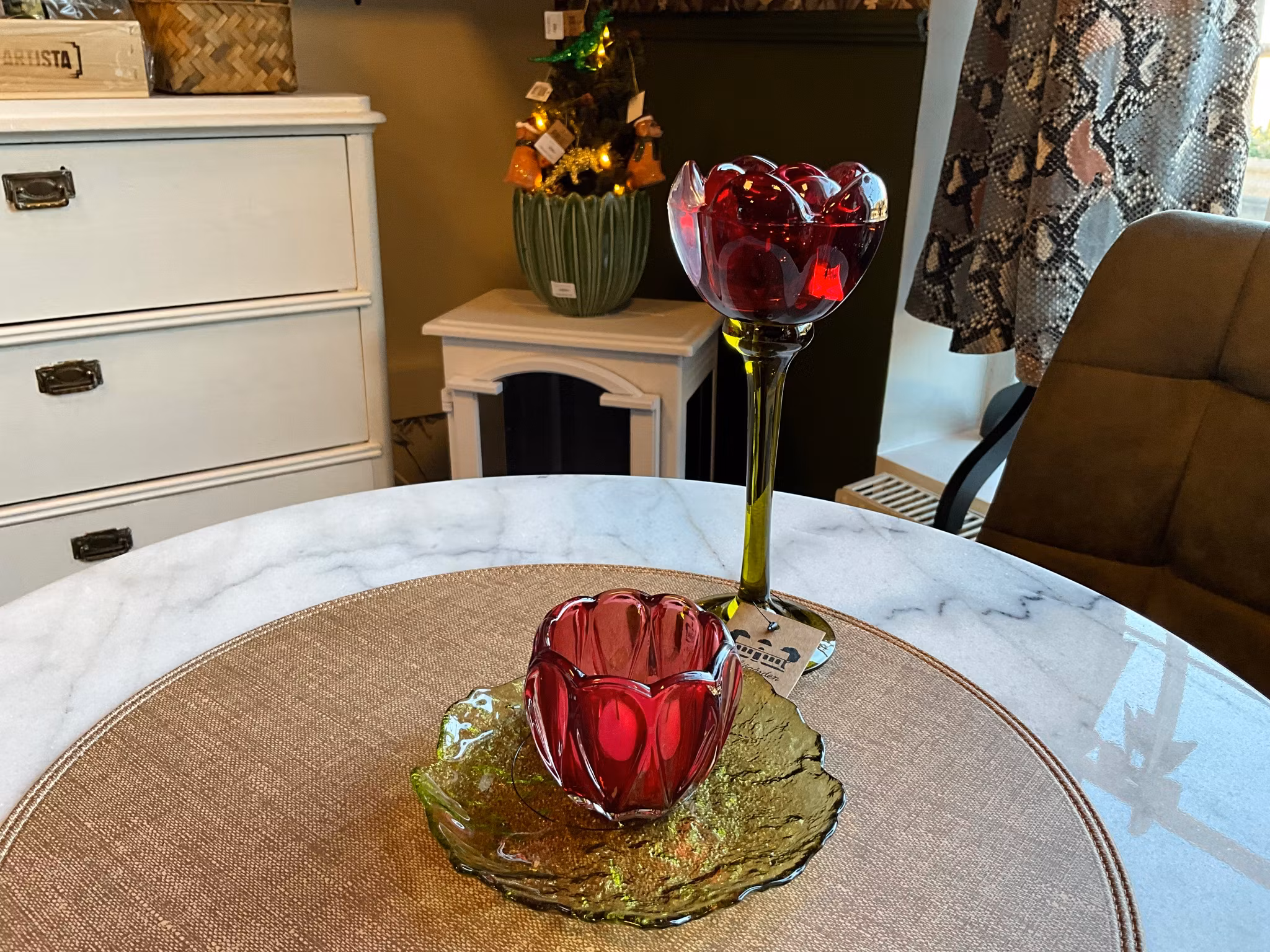 Vacker ljushållare av glas. Låg, röd. Svedala.