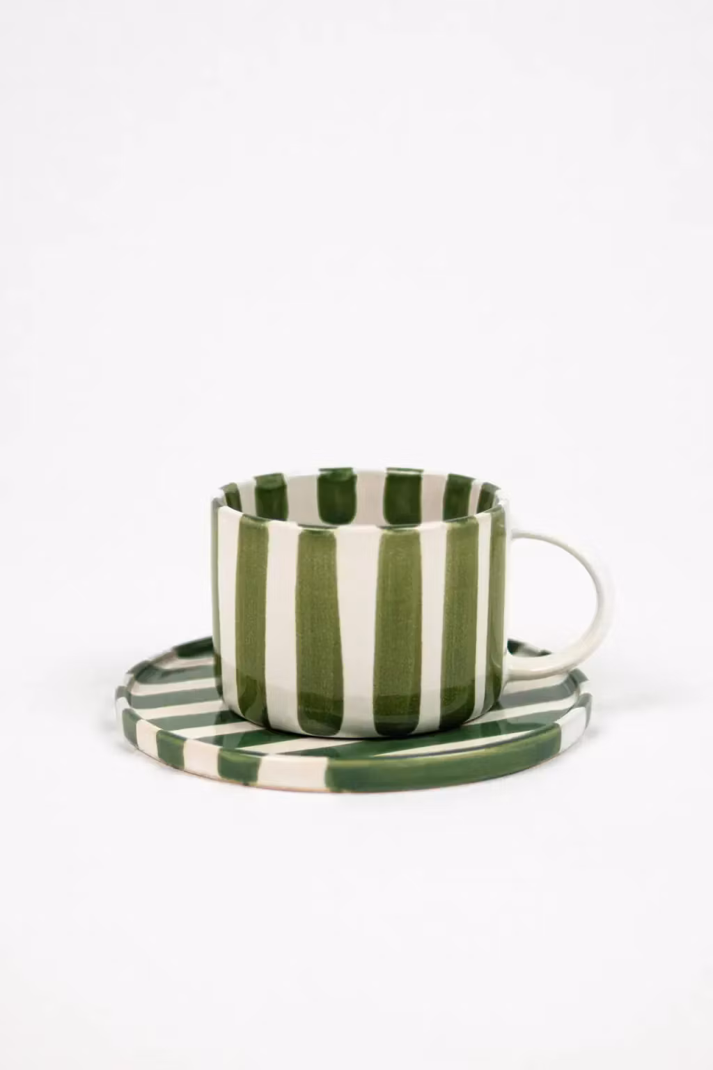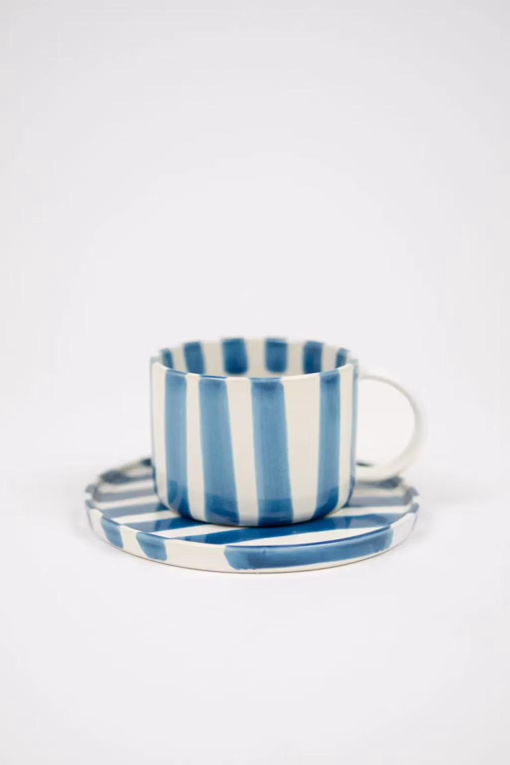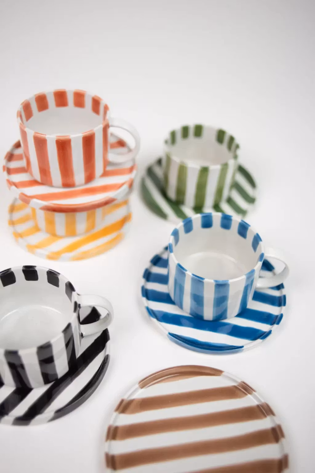 Monica är en handmålad kopp med ett glatt uttryck och ett tillhörande fat. Den finns i flera härliga färger som är fina att kombinera.