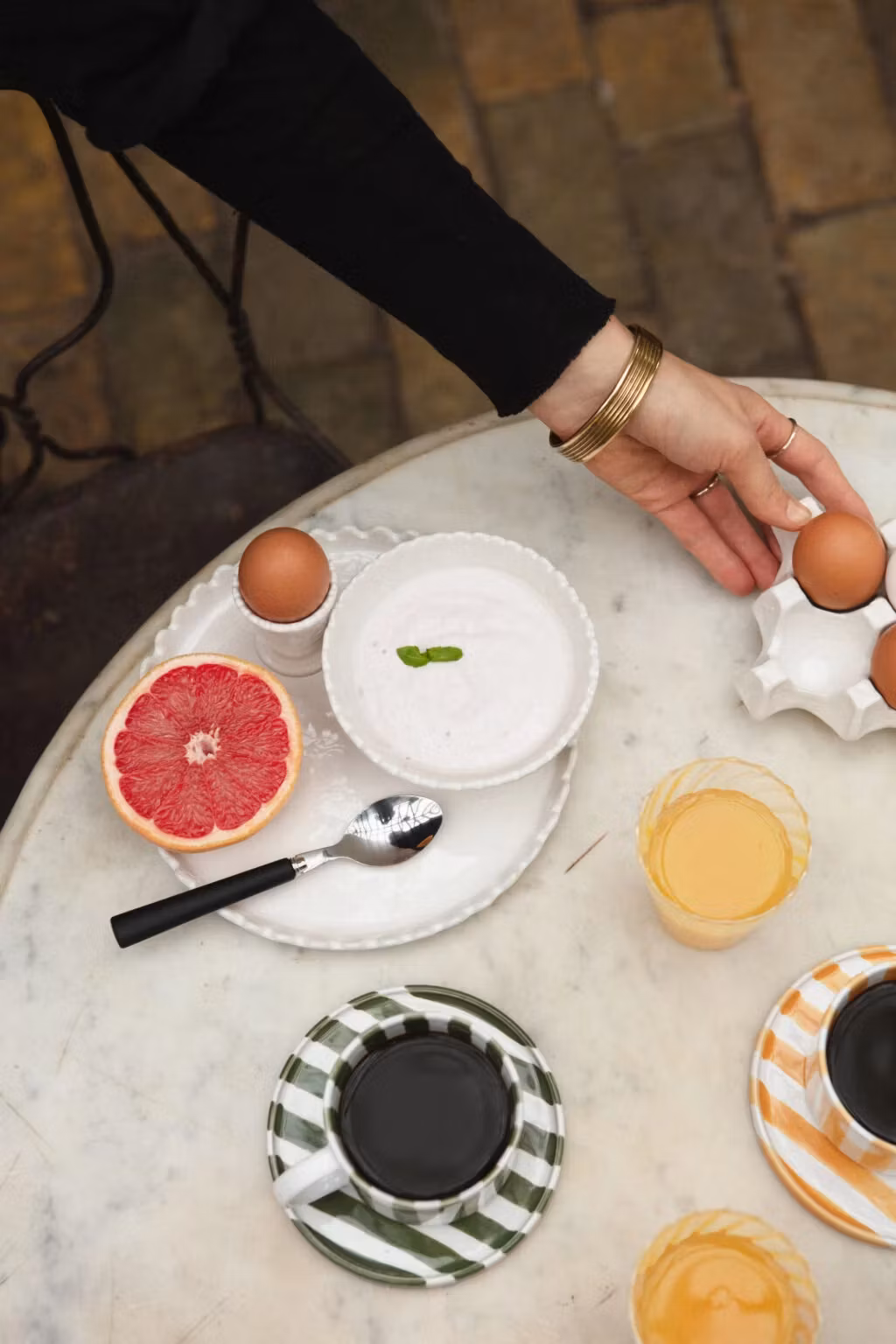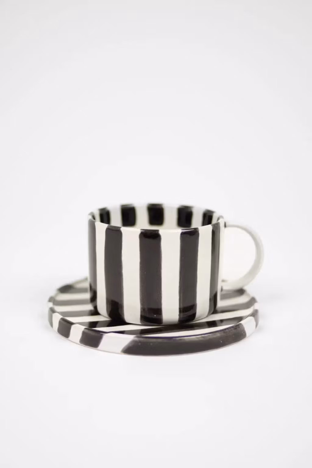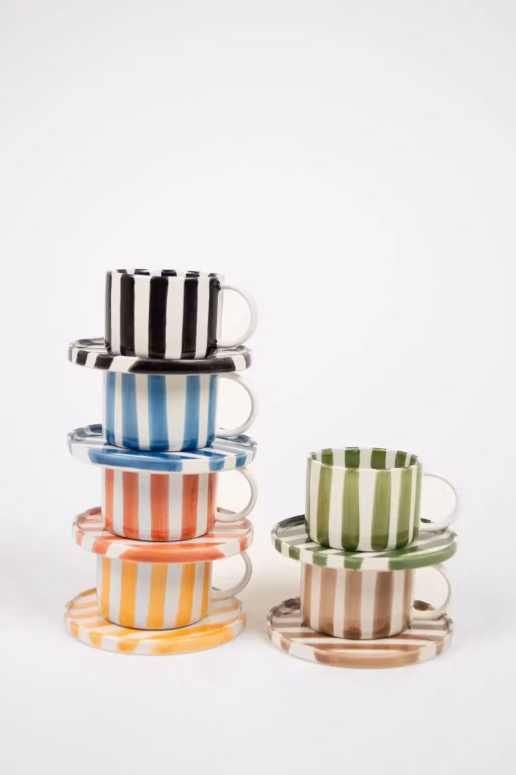 Monica är en handmålad kopp med ett glatt uttryck och ett tillhörande fat. Den finns i flera härliga färger som är fina att kombinera.
