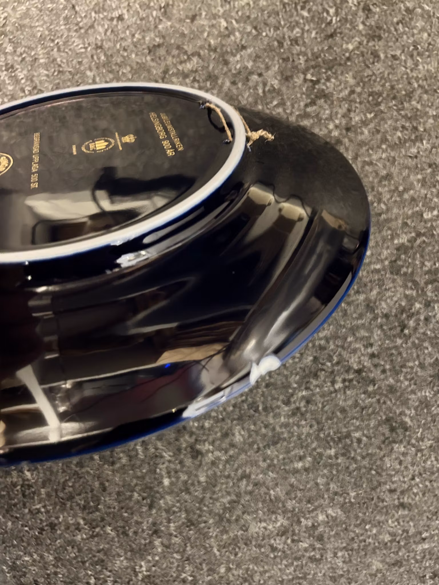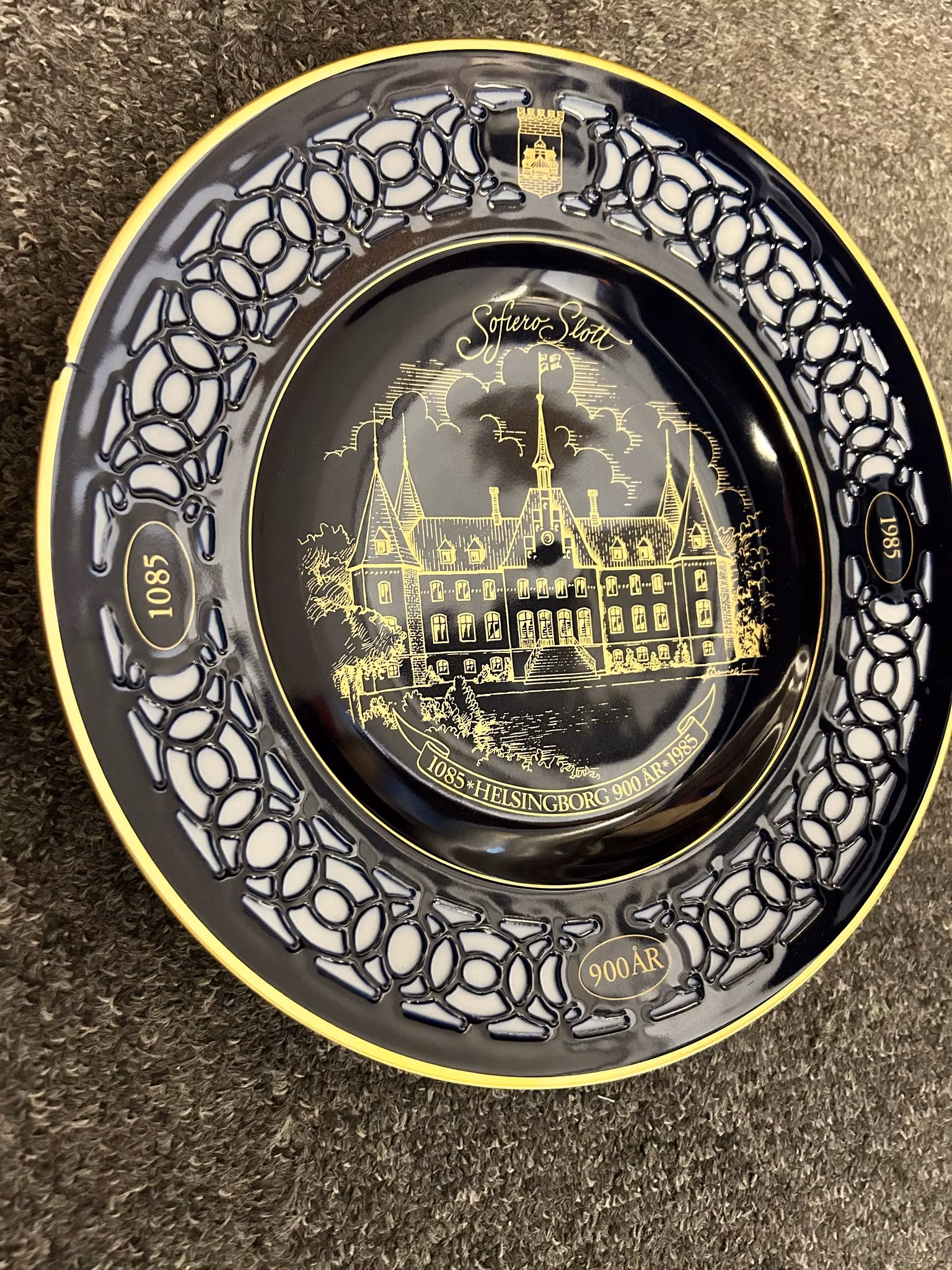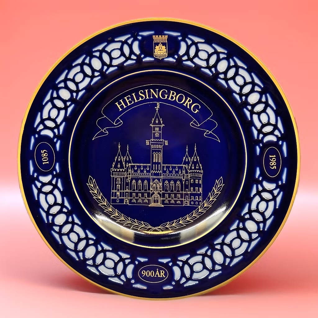 Den blå minnestallriken är en jubileumstallrik för Helsingborgs 900-årsjubileum, tillverkad av Bing & Grøndahl (Copenhagen porcelain).