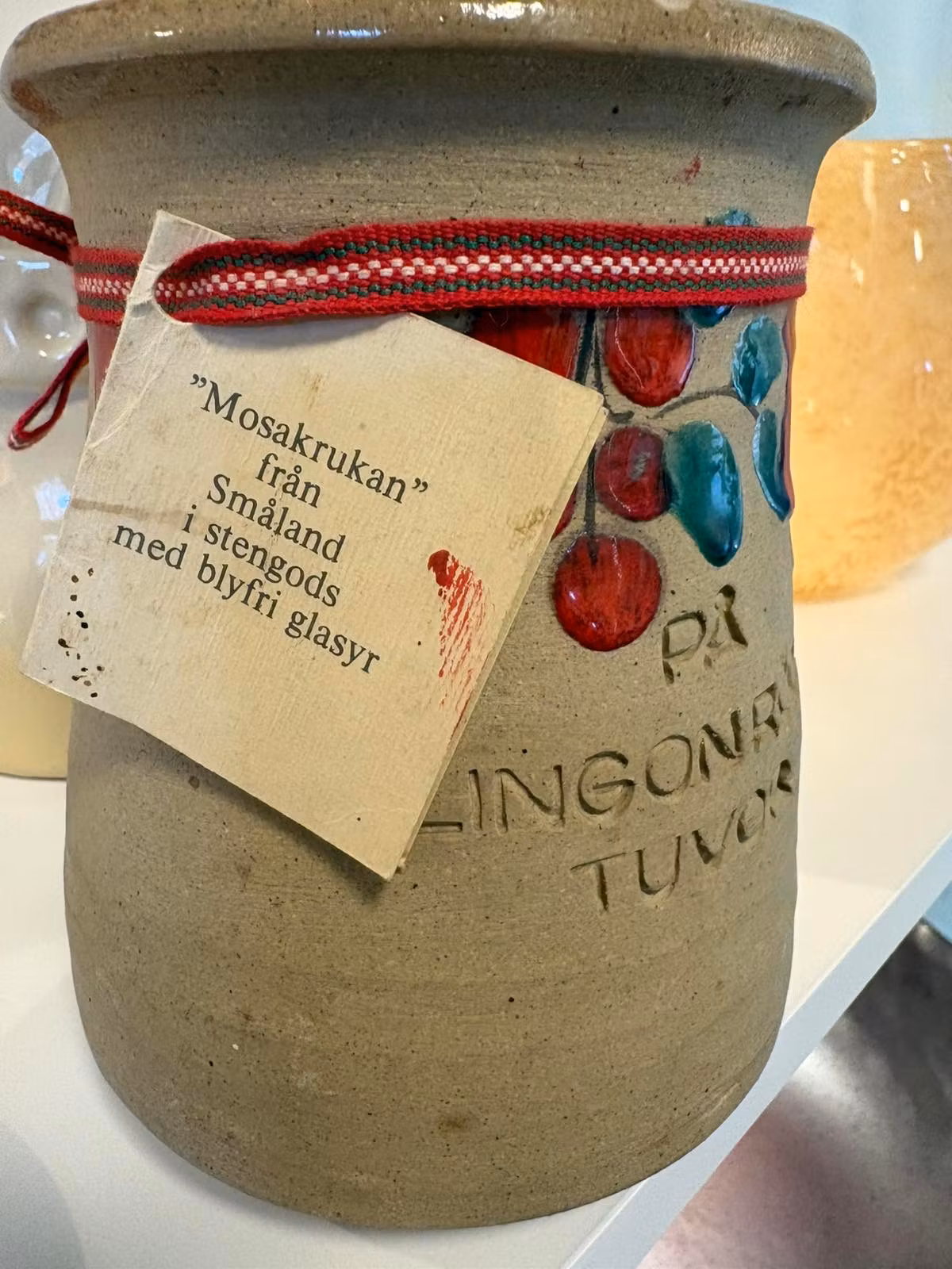 Rustik Småländsk Keramikkruka - Mosakrukan, lingonmotiv 🇸🇪