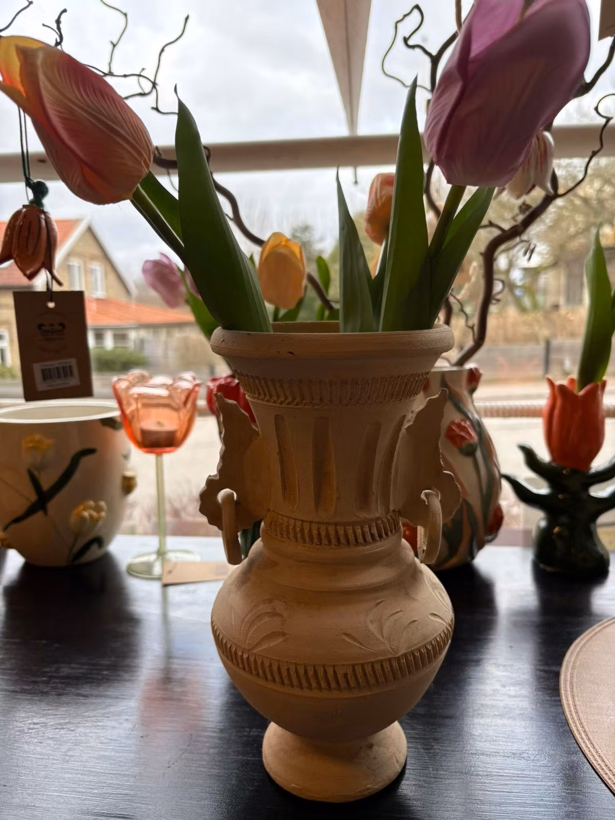 Vacker rustik urna i amforastil, med två hänklar.